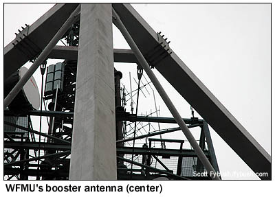 There's another new FM antenna since our last visit: just above the top of the steel framework surrounding the base of the tower, there's a set of yagi antennas for WFMU-FM1, the 22-watt on-channel booster for WFMU (91.1 East Orange NJ), which was in testing mode when we visited in 2009.