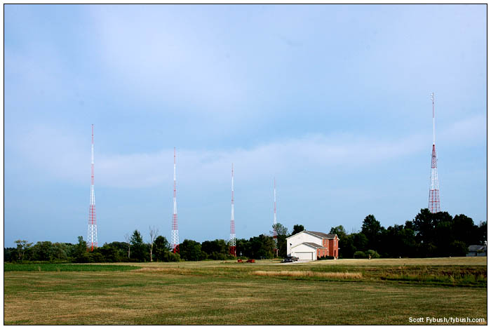 October 21, 2011 WKJG 1380, Fort Wayne, Indiana![]() It's Tower Site Calendar time - and that means the next few installments of Tower Site of the Week will be devoted to the sites you'll find depicted in the brand-new 2012 edition, now available for immediate shipping. In this week's installment, it's the November 2012 page - the unusual five-tower array of Fort Wayne, Indiana's WKJG (1380). Site of the Week readers know that we spend a lot of time in norfheast Indiana, what with our in-laws being there and all - yet somehow, we've never done a proper feature on Fort Wayne's "other" AM stations, the ones that have perpetually lived in the shadow of market giant WOWO (1190). But there's a lot that's interesting in the history surrounding WKJG, and as you'll see, WOWO comes into the picture here anyway. The history: WKJG was the first fulltime AM to sign on in Fort Wayne after World War II, when changes in FCC rules and the maturation of directional AM technology allowed for a flood of new signals on the so-called "regional" (class III) channels such as 1380. When it debuted on November 15, 1947, WKJG joined a roster that already included WOWO and its former sister station, WGL. (WGL, which we'll feature in more detail sometime later on, had been paired with WOWO from the late 1920s until the end of duopoly in the 1940s. Westinghouse sold WGL to TV inventor Philo Farnsworth, and the station later ended up in the hands of the News-Sentinel, the afternoon paper. Along the way, it also took advantage of the postwar AM upgrades to go from a "graveyard" facility on 1450 to a regional channel, 1250, opening 1450 to be used again by another new Fort Wayne signal, WANE, later known as WLYV.) The new WKJG also had a newspaper connection: it belonged to the morning paper, the Journal Gazette, whose publisher, William Kunkel, gave his initials and the newspaper's to the new station, which established studios on the city's south side at 3802 South Calhoun Street and a transmitter facility out at the southern edge of town just off US 27/33, the main highway heading south from Fort Wayne. The site was fairly complex, by 1947 standards: five towers, four of them 198' tall in a line and a fifth, 371' tall, set off at a dogleg. The new WKJG was (and still is) the second most powerful signal in town, running 5000 watts day and night, using the tall tower and two of the short ones by day and all four of the short towers at night. Both the day and night patterns put a similar and fairly broad lobe north-northwest over the city of Fort Wayne; by day, there's a similar lobe pointing south-southeast, and both patterns have deep nulls to the east-northeast and west-southwest, protecting signals that at the time would have included WSPD 1370 in Toledo and KWK 1380 in St. Louis.