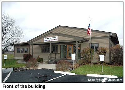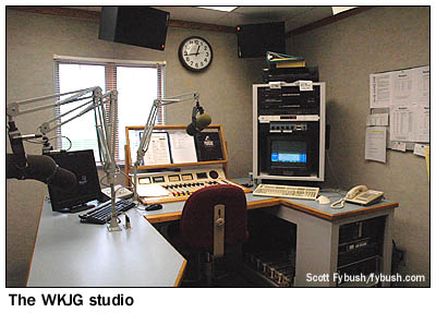 As exciting as the venture into radio must have been for WKJG, there were soon even bigger projects on the horizon. In 1953, WKJG-TV (Channel 33) signed on as Fort Wayne's first TV station, operating from studios and transmitter facilities on Fort Wayne's northwest side. By 1957, the radio and TV stations had come under new ownership headed by the Dille family of Elkhart, publishers of the Elkhart Truth, putting WKJG at the core of what would eventually come to be known as Federated Media, which still owns the station today. The WKJG calls left radio in 1971 when the Dilles sold WKJG-TV; AM 1380 became top-40 WMEE, while its relatively new FM sister on 97.3 became WMEF. Seven years later, the WMEE calls and top-40 format moved to the FM, flipping the AM to country and western as WQHK. By then, the studios had moved from the WKJG-TV building on West State Boulevard down to the transmitter site south of Fort Wayne at 2915 Maples Road, where they remain today in a facility that's grown in stages from the original little transmitter building of 1947. The first addition pushed straight forward from the old transmitter room, with studios for the AM and FM stations along a hallway that led to the transmitter room from a new front lobby and office area, and it served WMEE and WQHK for more than two decades. Then things changed very dramatically in the 1990s as a second FM signal joined the cluster. Initially an LMA, WQHK-FM (105.1 Decatur) was the result of a complex move-in that transformed a small-town class A 20 miles south of Fort Wayne (the former WQTZ 92.7) into a full-market B1. As country "K105," WQHK-FM soon shot to number one in the ratings and stayed there. And then came an even bigger bombshell: the high-profile sale of WOWO from Price Communications to New York's Inner City Broadcasting, which never operated WOWO, instead arranging for it to be downgraded to 9800 watts at night...and sold to Federated to become a new sister station to WMEE, WQHK and WQHK-FM. That meant a move for WOWO, which left its downtown studios and famed fire escape to move to an expanded Maples Road facility. The old studio space near the transmitters (and much of the transmitter room itself) was converted to sales space, with a new lobby and conference room at the front of the building and a new addition along the north side of the building. That new addition was - and still is - the studio space: a long line of studios for WOWO news, WOWO talk, K105, WMEE and two production rooms, with another studio across the hall at the back of the building for AM 1380. The AM station slid through several calls and formats in the 1990s: standards "Radio Hollywood" WHWD, One-on-One Sports WONO, and then ESPN Radio - and in November 2003, the original calls returned when WKJG-TV became WISE-TV, allowing 1380 to once again be WKJG(AM). (Federated now owns two more stations in town: rockers WFWI 92.3 - "the Fort" - and WBYR 98.9 - "the Bear" - operate from a separate studio north of downtown. That building is known within the cluster as "FedMed North," which makes this...yup, "FedMed South.")