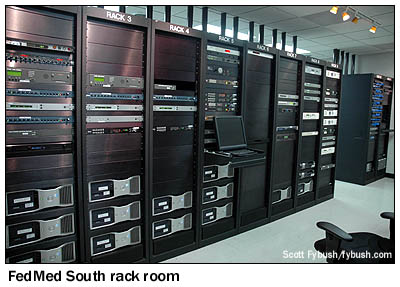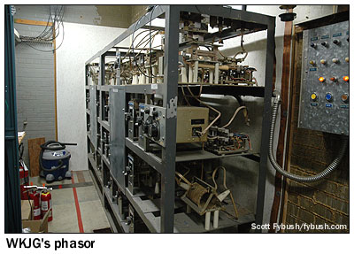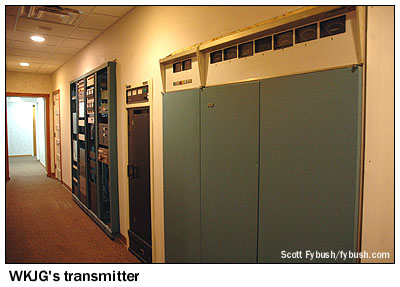 So with all that history under our belt, shall we take a tour of the present-day facility? The most recent change at Maples Road came just a few years ago, when the cubicles in the old transmitter building were replaced with a spacious new rack room for all the stations, turning the space in front of the 1380 transmitter into a hallway with a big window looking into the new tech center, shown at the top of the page. WKJG's main transmitter is the little Harris SX5 shown above at center; the RCA next to it is an aux, and behind it there's a locked room that's home to the open-frame phasor.
