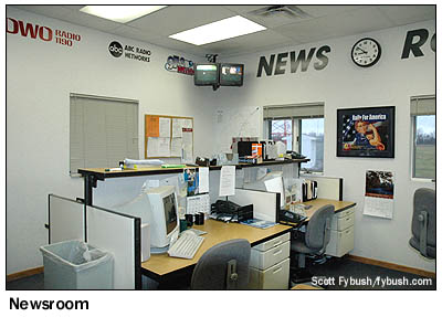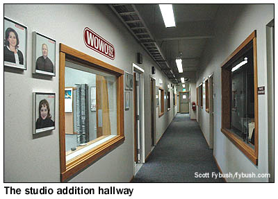 The studio cluster along the north side of the hallway hasn't changed much since the new addition went up: the WOWO newsroom anchors the northwest corner of the building, with a window looking into the WOWO air studio. Because of the proximity to the WKJG array, the addition was built with lots of shielding, including fairly heavy copper screening in the windows that look out to the AM towers. (Speaking of the 1380 towers: that tall "tower #5" may have been the original home of WKJG-FM on 97.3, though I'm not certain of that. It may also have been used for a brief earlier incarnation of WKJG-FM on 106.1 in the 1950s. I do know with some certainty that it was the home of another new FM signal not owned by Federated Media, WJFX 107.9 New Haven, from its debut in 1990 until it moved to a taller tower nearby in 2000.)
