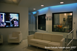 When WOR moved in here, it took over what had been office space at the back of the building. There’s a newsroom back here, several production rooms (built out, in part, for a national morning syndication offering that never materialized), and two big talk studio/control rooms, one of them looking out to a glassed-in area that can be used for call screening or for a guest’s entourage.
