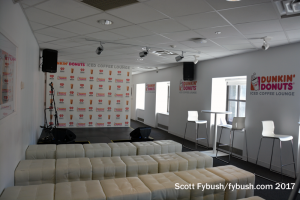 Head in one direction off the lobby and you’ll see one of those rare common spaces, another smaller live-performance area that’s been carved out and heavily branded by Dunkin Donuts.