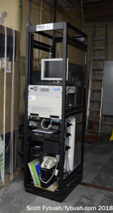 At WXXI’s building, there’s been plenty of rearrangement since our last visit. WXXI-TV (Channel 21) had a catastrophic failure of its old Thales transmitter a few months earlier, and delivery of its new repack transmitter, a GatesAir Maxiva, was moved up to get the signal back on the air at full power faster. That transmitter will move from WXXI’s current RF 16 to its repacked channel, RF 22, later on – but for now, it’s chugging along on 16 from a spot behind the old Thales, in what used to be the transmitter row for WXXI-FM (91.5). WXXI-FM’s old Harris still sits here as a backup (its predecessor, an even earlier Harris, was scrapped out to make room for the Maxiva); the current main WXXI-FM transmitter, another GatesAir, sits across the room, facing the transmitter row for WRUR (88.5). (Look closely above and you can also see the rack on the right for W234AZ, the 94.7 translator for Family Life Ministries’ regional network.)