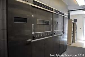 Two buildings over from WXXI is the similar-looking brick building of Rochester’s ABC affiliate, WHAM-TV (Channel 13), and we stop upstairs there for a quick “before” peek. This is an unusual room here, because it still contains every transmitter Channel 13 has used since it signed on in 1962 as WOKR. That massive original 1962 RCA transmitter still has pride of place in the middle of the room, with the G-Line RCA that succeeded it built into a wall to the left. To the right is the current solid-state Larcan that powers WHAM-TV’s current digital signal on RF 13, but not for much longer – WHAM-TV will be repacked to RF 9 soon.