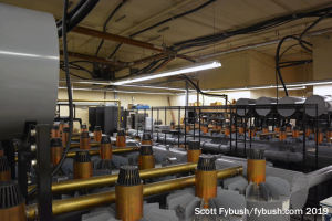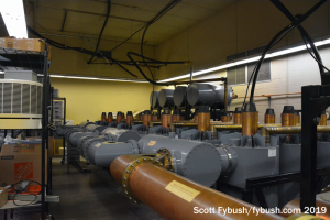 There’s a massive combiner room here, part of ERI’s overall facility design. With 100 kW ERP for each of these class C stations, there’s a lot of RF headed up the pipe to the twelve-bay cogwheel antenna (actually, two separate six-bay antennas) at the top of the tower.