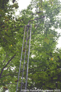 Armed this time with portable radios with signal meters and a burning desire to avoid a second humiliating failure, we tramped into the woods above the campus and soon found WALF’s little tower and transmitter shack, all but invisible in the forest that has grown around it since it signed on FM in the 1970s.