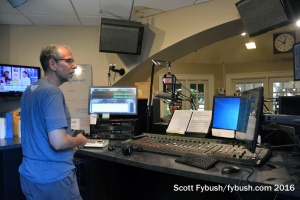From there, a door leads into the main studio complex, which consists of a talent area set down a few steps from the control console at the back of the room. This showcase studio was just wrapping up Bill Cody’s morning show when we stopped by; that’s Cody’s morning sidekick Charlie Mattos at the board across from Bill.