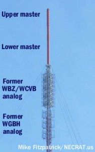 As we reported last week, WBZ-TV (Channel 4/RF 30), WCVB (Channel 5/RF 20), WSBK (Channel 38/RF 39) and WGBX (Channel 44/RF 43) have been temporarily relocated to the lower master antenna, which is still functioning – and which had been the home of WGBH-TV (Channel 2/RF 19). Because WGBH and WCVB can’t share the same antenna, WGBH has moved to WCVB’s lower-power standby antenna further down the tower, and now it appears the station will be stuck there for a while. “We understand how frustrating it is to be without the WGBH service, but we are doing everything possible to see that repairs are made as quickly as possible, with consideration for the safety of the work crews,” says a statement from WGBH. The station says it could take a month to get all the work done, which is bad news for Channel 2 viewers in outlying areas who depend on over-the-air reception of the signal (or whose cable systems pick up WGBH over the air.) And given how complex antenna work can be at the top of a tall tower, and how unpredictable New England weather has been this spring, even that estimate could prove to be conservative. We’ll be following along as the stations and tower owner Richland Towers work through the project. *Out west, there’s a new morning show at WBEC-FM (95.9 Pittsfield), where Glen Turner starts tomorrow. He’s worked at Boston’s WMKK (93.7) and at WERZ (107.1) in Portsmouth, N.H. *All of America mourned Wednesday as news spread of the death of Dick Clark – but long before “the world’s oldest teenager” was a national TV and radio fixture, he was doing local TV and radio in upstate NEW YORK. For Clark, “it all started at a little 5,000-watt radio station in Utica,” where Clark was well-connected indeed. His uncle owned WRUN (1150) and WRUN-FM (104.3), and his father, Dick Clark Sr., was managing the stations when Clark made his on-air debut as a college student in the late 1940s. Clark went across town to get his first full-time gig after graduating from Syracuse University in 1951, becoming “Dick Clay” on WKTV (then on channel 13), hosting an afternoon country music show called “Cactus Dick and the Santa Fe Riders” – and it wasn’t long before Clark’s talent bought him a ticket south to PENNSYLVANIA and a new job at Philadelphia’s WFIL-TV (Channel 6), where the rest was history. (Our colleague Peter Naughton has much more on Clark’s central New York roots over at CNYRadio.com…) *In Philadelphia, Merlin Media’s WWIQ (106.9 Camden NJ) enters its second week stunting as “Hannity 106.9″; while it’s widely expected that the station will be going all-talk soon, Merlin remains in “no Rush” to reveal its eventual lineup. Congratulations to WWIQ’s competition, CBS Radio’s KYW (1060 Philadelphia), the only NERW-land station to return from Las Vegas with the NAB’s Crystal Radio Award for exemplary community service. *CONNECTICUT radio owner John Fuller was another NERW-land visitor to the NAB Show (we spotted him on the floor along with one of his top executives, Red Wolf Broadcasting VP Brian Ram) – and he’s adding to the signal reach of his new WJJF (94.9). The news-talker is licensed to Montauk, New York, and Red Wolf is now buying a translator there. It’s paying Community Bible Church $10,000 for W230BH (93.9). Five Years Ago: April 21, 2008 – *The oldest broadcast studio site in continuous use in MASSACHUSETTS could have another occupant soon. WBZ (1030) began building its broadcast center at 1170 Soldiers Field Road in 1947, and along with sister station WBZ-TV (Channel 4), it’s called the site home ever since. Through multiple renovations and expansions over the years, the building has also been home to WBOS shortwave, WBZ-FM (100.7/92.9/106.7), WODS (103.3) and today to WSBK (Channel 38).