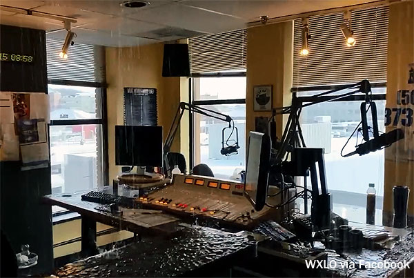 The stations were back on the air with automation and generator power by Thursday afternoon, but corporate engineers were soon in the air to assess the damage and figure out a recovery plan. The WXLO main air studio (above) appears to have taken the worst hit, completely soaked by water coming down through the ceiling from upper floors; while it’s likely a total loss, the other studios and offices (and the all-important technical core) mainly had water on the floor and some damage to the walls.