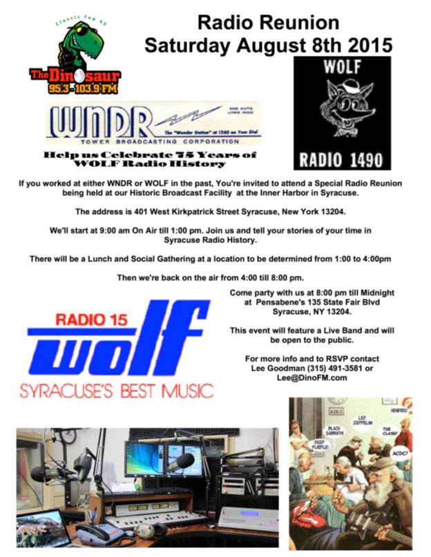 In Syracuse, we still have fond memories of the reunion that Craig Fox’s WOLF (1490) staged for veterans of the historic top-40 signal more than a decade ago – and now we’ll get to do it all again! On Saturday, August 8, Fox will stage another reunion at WOLF’s longtime Kirkpatrick Street home, but this time the reunion will include not only WOLF veterans but also alumni of WOLF’s old rival, WNDR. WNDR’s old AM home at 1260 is now Cumulus’ WSKO, but Fox has the WNDR calls in place on his “Dinosaur” oldies at the Kirkpatrick Street studios.