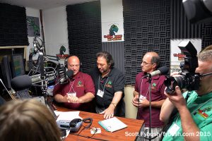 Above: Mastriano and Wray; Rhodes and Caplan on the air. Below: Vann, Cavanaugh, Snyder, Rhodes and Markert; the Dinosaur crew wraps up the morning broadcast
