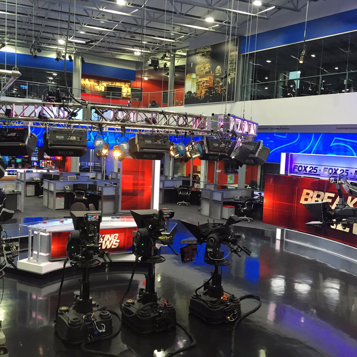 The new set features a huge video wall (20 feet long and 6 feet tall) and several additional video screens that flank a view of newsroom cubicles and control rooms; it also removes the last on-air vestiges of the old Fox O&O “25” logo that was replaced last year.