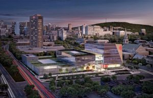 Across the street from CJAD’s Boul. Rene-Levesque studios, there are some big changes coming at Maison Radio-Canada. The network unveiled the first public set of drawings for the new home it will occupy on the site starting in 2020, after it vacates the 1970s-era Maison Radio-Canada skyscraper next door. That building has already been sold to a developer which will reuse it for non-broadcast purposes; Radio-Canada/CBC will relocate to what’s now a parking lot on the east side of the property at the corner of Rene-Levesque and Ave. Papineau, directly across from Bell’s radio and TV digs.