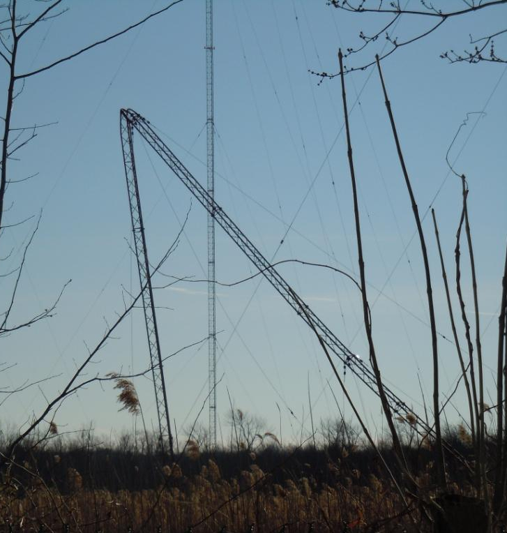 *Engineers in NEW YORK‘s Rockland County have been watching for a few months now to see what will become of the four-tower array at WRKL (910 New City), where one tower began tilting noticeably back in December. How long could it keep standing with one broken guy wire? Until last Monday, it seems – that’s when that tower folded over on itself in the swamp just off US 202.