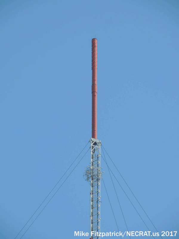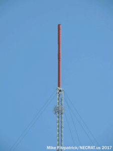 That panel antenna just below the UHF TV antenna at the top of the mast is the shiny new WBUR (90.9 Boston) antenna, part of the public radio station’s project to drop power and increase height (from 12 kW/305 m to 8.6 kW/358 m) with a new directional pattern that’s aimed at putting more signal over Worcester.