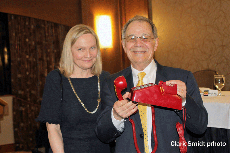 It was a who’s who of WRKO history at the Crowne Plaza in Newton on Friday night for the reunion dinner hosted by former PD Mel Phillips, shown here with the “red phone” hotline that was a gift from his former airstaff.