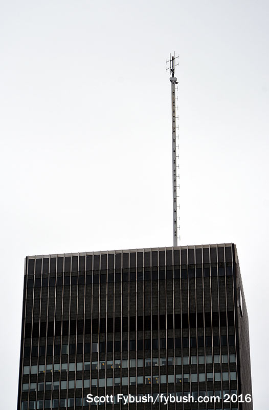 In Montreal, Cogeco has completed a big FM consolidation that now has all four of its signals sharing a master antenna up on Mount Royal. The biggest change, of course, is to CKOI (96.9), which has signed off for good from its longtime grandfathered 307 kW home atop the Bank of Montreal skyscraper downtown (shown at left in 2016), moving up in height to Mount Royal but dropping power to 148 kW to maintain its superpower coverage.