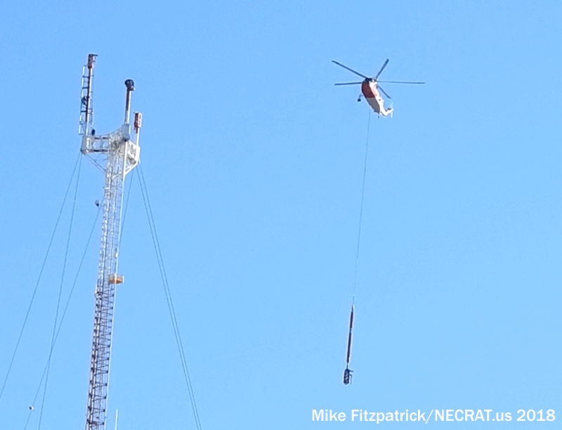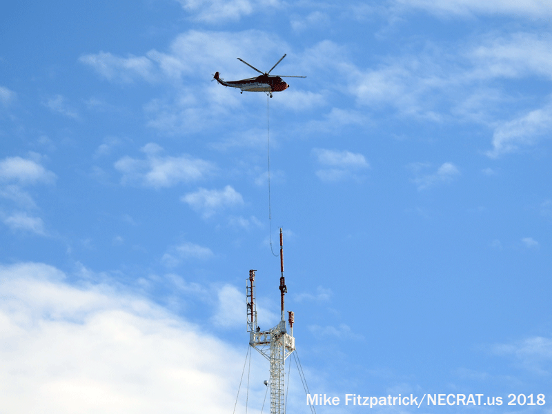 Getting there, however, will be a little more of a challenge, and that’s where the big helicopter lift at the end of December came in: in order to make room for a new master UHF antenna that will be mounted right at the top of the Cabot Street tower, the existing antennas on the three arms of the candelabra had to be removed, and that took multiple helicopter lifts over the course of the weekend. It also required WFXT to move to Cedar Street for now; later in the process, the Cedar Street stations will move to their new auxiliary facilities at Cabot Street when the Cedar Street antennas are removed and replaced.