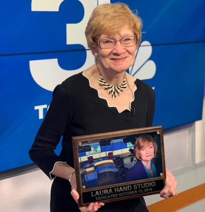 In Syracuse, Laura Hand’s final newscast on WSTM (Channel 3) on Saturday morning was celebrated by an entire studio full of family members and current and former colleagues. As befits a career that stretched back more than four decades, Hand was honored by having that very studio renamed – it’s now the “Laura Hand Studio,” with a plaque right at the door.
