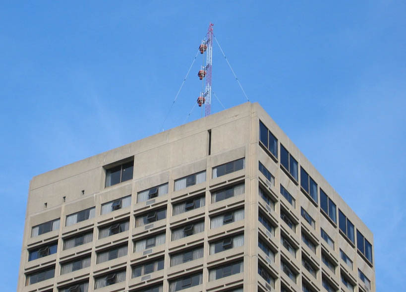 *The call letters of MIT’s WMBR (88.1 Cambridge) stand for “Walker Memorial Basement Radio,” but the programming that originates in the basement studios at the Walker Memorial Building on the MIT campus has to go to a transmitter site elsewhere on campus for broadcast to greater Boston. That spot is the top of the Eastgate Building, where WMBR has transmitted with 720 watts/90 meters for many years. (photo: wmbr.org)