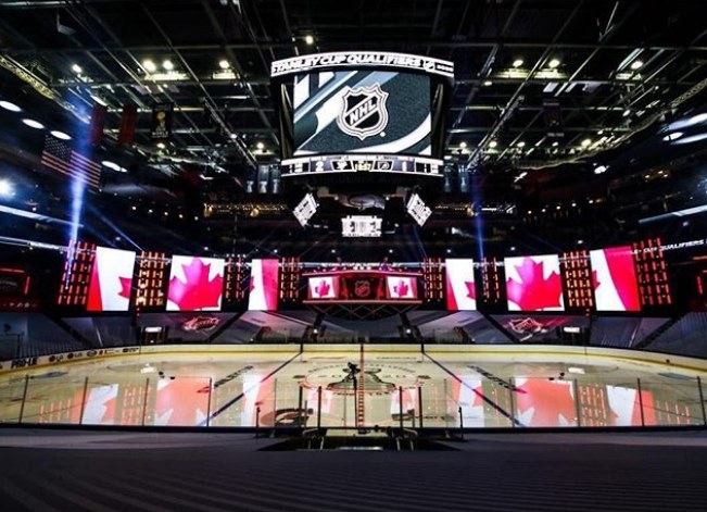 In Toronto, that’s an NBC crew imported from the U.S., undergoing a very strict quarantine regime before being allowed out of their hotel rooms into what’s still a restrictive bubble around the Scotiabank Arena, where the stands are now obscured by huge video screens that have essentially turned the place into a giant TV studio – which is exactly what it is for now.