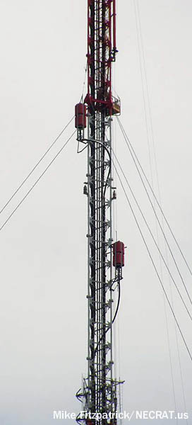 Now it”s time to bring down the failed antenna so it can be shipped back up to Dielectric in Maine for repair or replacement, and our colleague Mike Fitzpatrick of NECRAT.us sends along this picture showing two new auxiliary antennas that just recently appeared on the tower, apparently to keep all the tower”s users on the air while workers are up by the top antennas. (Notice the man lift that”s also perched on the side of the tower now?)