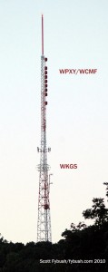 Radio Towers on the Move: Clear Channel’s top-40 WKGS (106.7 Irondequoit) has a slightly new nickname – “Kiss 106.7” instead of “106.7 Kiss FM” – and a new transmitter site. The class A signal has completed its relocation from the Seneca Towers apartment building on the north side of the city to the centrally-located Pinnacle Hill tower farm, boosting power a bit from 3.5 kW/266′ to 4.4 kW DA/328”. The move, which was made possible when Clear Channel moved what’s now WSYR-FM (106.9) closer to Syracuse two years ago, puts Kiss on the very same tower as its archrival, Entercom’s WPXY-FM (97.9).