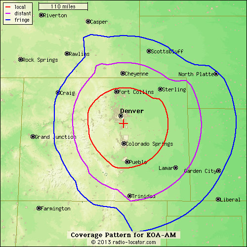 It’s not just water that can affect what happens to a “non-directional” signal. At right above is R-L’s map of KOA (850) in Denver, which is a non-directional 50,000-watt signal that goes out just the same in all directions from one big tower in Parker, Colorado, just south of Denver. But wait – that’s not a circle, is it? To the west, KOA’s signal hits the Rocky Mountains, which, being rocky, don’t conduct AM signals very well at all. To the east, by contrast, that rich soil that extends out to Kansas and Nebraska carries KOA quite well indeed.