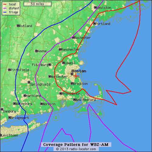 The map on the left is a map of WBZ’s transmitted pattern: its two towers on the coast in Hull, Massachusetts send out their signal day and night in a simple pattern called a “cardioid”: to the west (at 270 degrees), it’s at full power; to the east (90 degrees), it’s at close to zero power, and that’s about it.