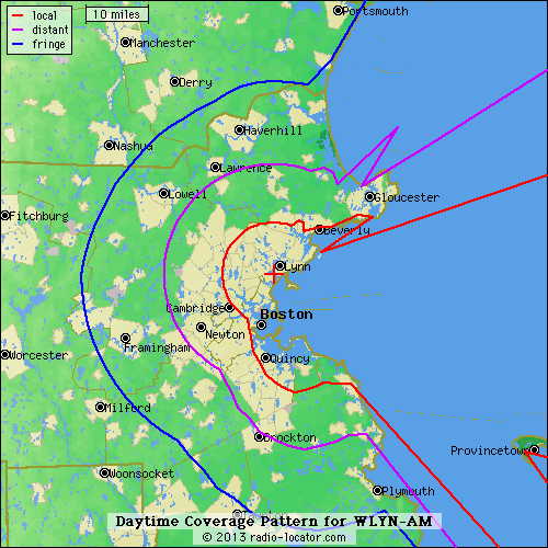 At left, that’s the daytime coverage map of WLYN (1360 Lynn), which is a 700-watt signal transmitting non-directionally from a site just inland on the North Shore, a dozen miles or so north of Boston. Non-directionally? Yes, indeed – and we don’t even have a map of WLYN’s transmitted pattern to show you, because it would be a perfect circle and so FCCInfo and the FCC’s own site don’t bother showing it.