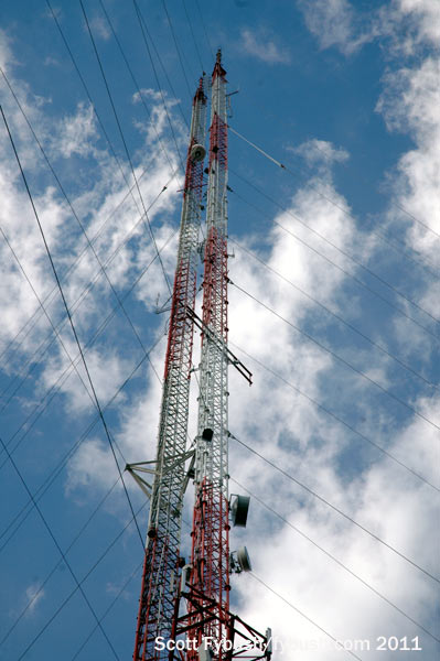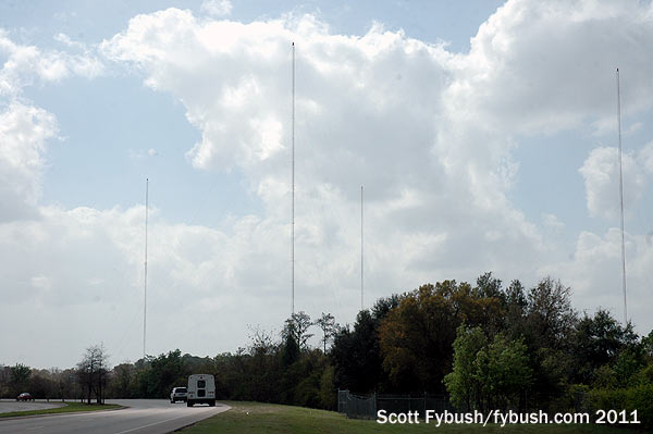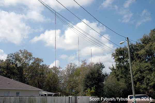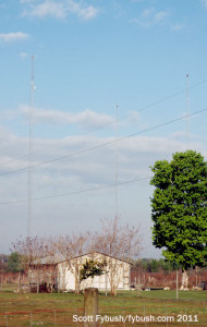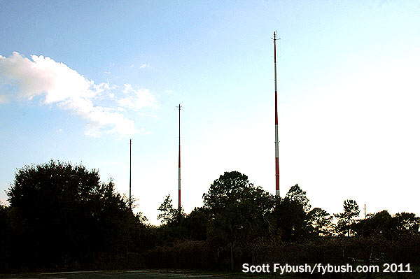 We didn’t make it to the WPRD (1440) site, which is east of I-4 in Winter Park, very close to the original WDBO location, and we didn’t get any pictures of the undistinguished WRMQ (1140) tower practically spitting distance from the WDBO/Cox studios on Silver Star Road. And on the way out to the WXXL site in Winter Garden, we somehow missed stops at two more AM sites in the Ocoee area on the west side of town, WUNA (1480 Ocoee) and the diplexed site shared by WLAA (1600 Winter Garden) and WOKB (1680 Winter Garden). Fortunately, our tower-photography doppelganger Mike Fitzpatrick was in Orlando less than a year later, and he has photos of all of those sites on NECRAT.us for your enjoyment. (But we did get closer than he did to one site south of town, and we offer it here for your enjoyment: the three towers of WIWA 1160 in St. Cloud, one of the closest AMs to the Magic Kingdom.)