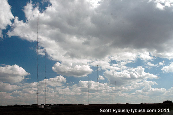 And then there’s the third “way out there” site. West of the Western Beltway tollway (FL 429) out in the farmland at the edge of the metro, 15 miles and a world away from downtown, is an imposing seven-tower array shared by Clear Channel’s two AMs in the market, WFLF (540 Pine Hills) and WYGM (740 Orlando). These stations each have impressive histories of their own: 740 came first, as daytimer WORZ, back in 1947. It remained at its original three-tower site on Old Winter Garden Road until the early 1990s, becoming WKIS for quite a few years doing AC and then news-talk, and then later WWNZ under Lowell Paxson’s ownership. By then, it was running 5000 watts by day and 1000 watts at night from the Winter Garden site, but it jumped to 50,000 watts day and night when it moved way out here. Today, it’s in its second incarnation as an all-sports station.