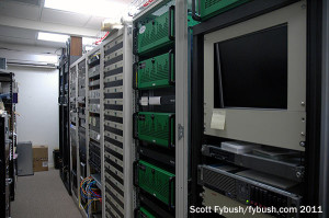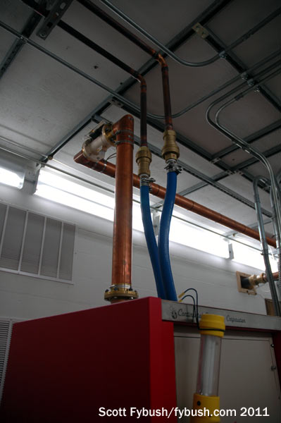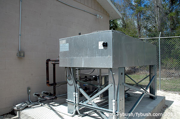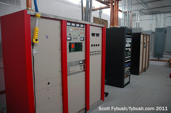 The downside, of course, is that there’s a bit of extra plumbing required: water lines going up from the transmitter, out to a heat exchanger mounted just outside the building, and back inside to cool the transmitter. It’s a nice elegant piece of engineering, and something you won’t see many other places.