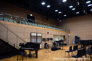From the lobby, we immediately head through a set of glass doors and down a flight of stairs to the studio core of the building, which is mostly underground. The whole building is constructed around Studio 1, a mammoth room (62 x 56 feet, with a 32-foot ceiling) designed for live orchestral performances and other big productions. The control room for Studio 1 is tucked neatly under the elevated audience seating, which is accessed just off the lobby at ground level.