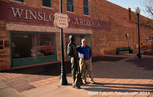 Yup, this is the “Winslow, Arizona” of Eagles fame, and the city honored the song a few years back by erecting a “Standin’ on the Corner” park, complete with Eagles music playing on the loudspeakers of the gift shop across the street, a big “66” logo painted in the intersection, a flat-bed Ford parked along the street (alas, with no girl to be found inside), and the obligatory photo-op statue. (Little could I have imagined when the photo above was snapped that I’d be back here at this same corner just a few months later – and once again with a traveling companion of classic-rock age who was nonetheless unfamiliar with the Eagles’ music. Go figure.)