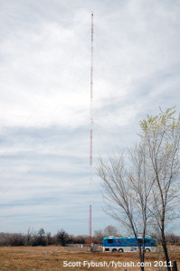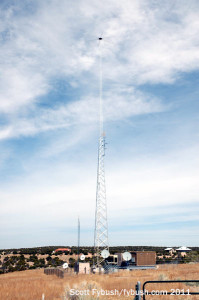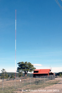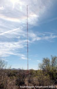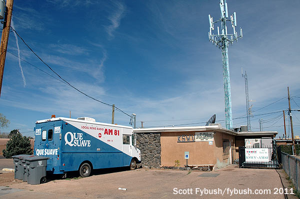 That tower off Alameda is also where we find that mystery “half-a-station.” In addition to KVSF and KTRC, this tower lights up at sunset with a third AM signal, an on-channel booster for Albuquerque’s KKOB (770). This 230-watt signal was first licensed on an experimental basis back in 1987 to help fill in the directional notch in KKOB’s main signal that protects New York’s WABC – but also cuts out much of the signal to the northeast, up I-25 toward Santa Fe. At least based on our limited listening around Santa Fe, the booster does its job just fine; at sunset that Friday, we heard the main KKOB signal drop down at sunset when the directional array kicked in, and moments later it returned to full local strength via the booster.