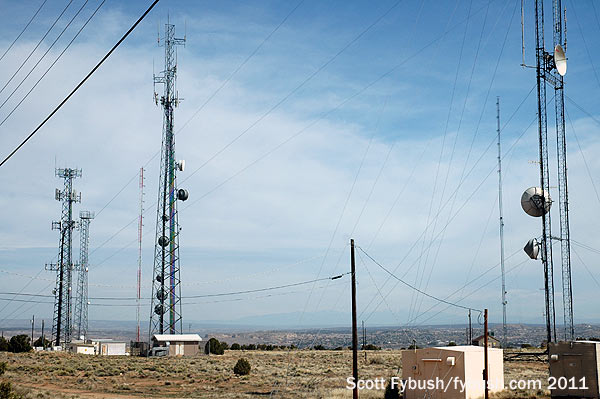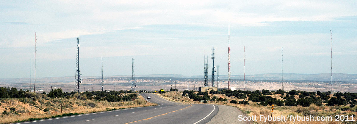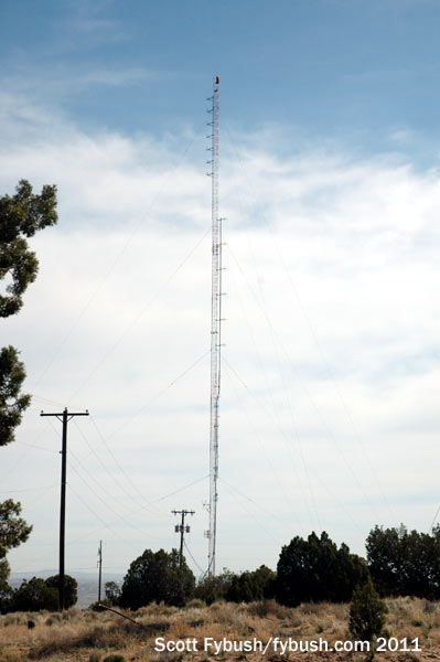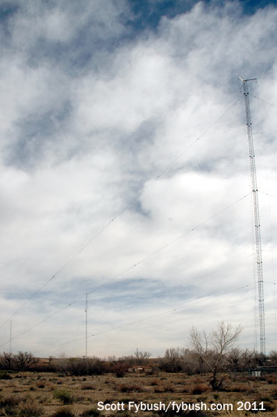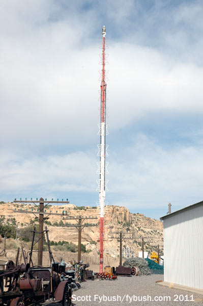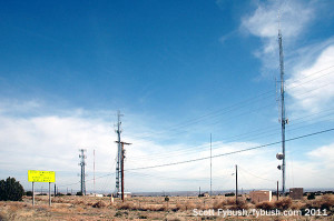Right across the highway from KOBF is American General Media’s FM tower, which is home to KRWN (92.9) as well as a 5 kW on-channel booster for KISZ (97.9 Cortez CO) – and since our visit, this tower has also added their new sister station, KPRT (107.9). And there’s one more tower to the south, not shown here, that’s home to two relays of Four Corners Public Radio from Colorado, KUSW (88.1 Flora Vista) and KUUT (89.7 Farmington), as well as religious KNMI (88.9) and several TV translators.