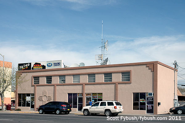 Look closely at the door on the right side of the building and you’ll see signage for another AM: KRZE (1280) is the local Spanish-language voice, with a transmitter site between Farmington and Aztec that we couldn’t quite get to – and when we visited in 2011, its license had actually been deleted, though it was later restored.