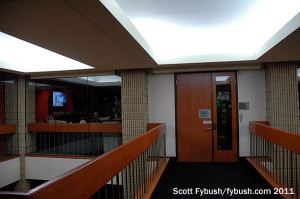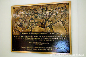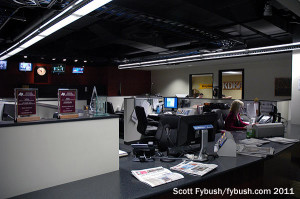 A simple left turn off the FM “studio row” brings us back to the new AM wing, where the fairly spacious newsroom was dedicated to the memory of longtime KDKA afternoon host Fred Honsberger, who died shortly before the station’s move out of Gateway Center.