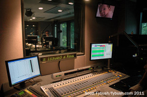 On one side (backing up to the original FM “studio row”) is a control room for talk programming, outfitted like the rest of the rooms with shiny new SAS Rubicon consoles. Across the main air studio, there are two smaller rooms that can be used as news booths.