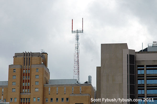 Pittsburgh’s TV towers are, for the most part, all located on the north side of town – with one very notable exception. East of downtown, in the Oakland neighborhood that’s home to the University of Pittsburgh and Carnegie-Mellon University, a distinctive tower topped with two antennas sits prominently on one of the city’s higher hills, home to public broadcaster WQED-TV (Channel 13) and its FM sister, WQED-FM (89.3).