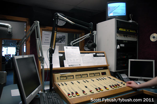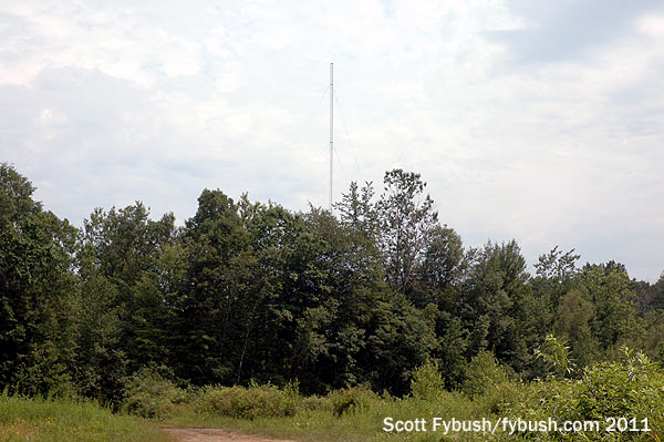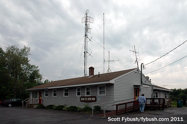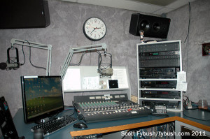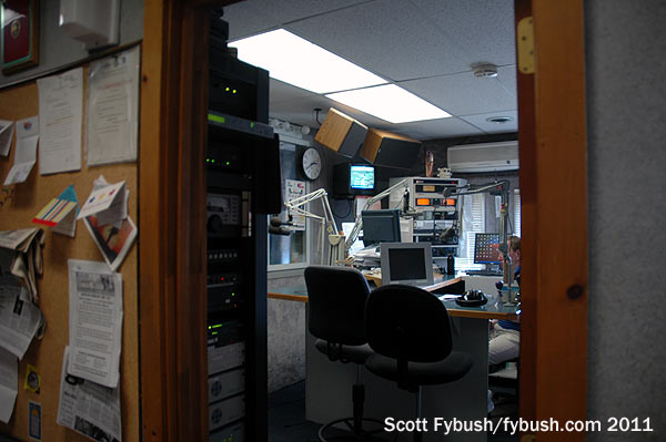 We didn’t get a tour, but we did get a shot of the tower out back shared by both AMs – and it’s a good thing we did, because that skinny AM tower was dismantled a few months later. After several months of AM silence, both AMs returned in mid-2012 from a beefier tower at the same site that’s also home to a Verizon Wireless installation…and yes, we’re looking forward to going back for an updated image.