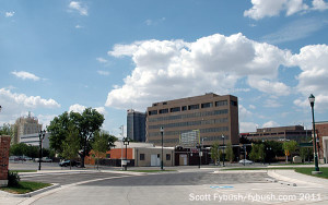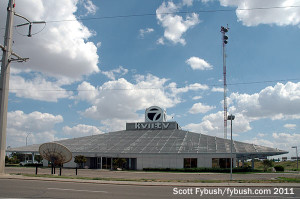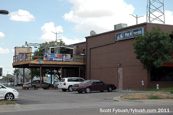 Across Pierce on the north side of 11th Avenue, facing out toward Fillmore Street, is where we find KVII’s competition: Fox affiliate KCIT (Channel 14) started out in this building and picked up a partner when Nexstar acquired the market’s NBC affiliate, KAMR (Channel 4), a decade or so ago. KAMR is the former KGNC-TV, and it moved downtown from an earlier studio site north of town. That prominent deck there, with a nice skyline view, is the “Sky Studio” for KAMR/KCIT newscasts – and we should note that this cluster also has the MyNetwork affiliate, KCPN-LP (Channel 33), which is also on a DTV subchannel of KAMR.