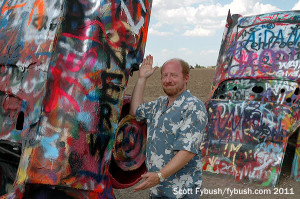 There’s one more stop to be made on the way out of Amarillo, though. “Cadillac Ranch” is more than an old Springsteen tune. It’s a real piece of artwork, first erected in 1974 at a site a few miles closer to town and then moved out to its present site in 1997 as development began to encroach. (There’s a slight broadcast connection here: eccentric rich guy Stanley Marsh 3, who provided the land and apparently the money for the artwork, is also the former owner of KVII.)