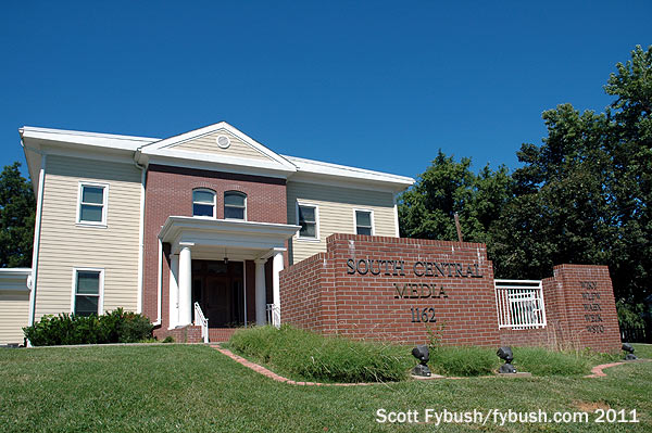 The Engelbrechts rebuilt on the ruins of the old mansion, creating a modern studio facility on the footprint of the original building, and over the years it came to be home to many more stations. On the AM side, 1400 became WJPS, then went back to its old WEOA calls before being sold off. On the FM side, the Engelbrechts’ South Central Communications added WJPS-FM (93.5 Chandler), a drop-in signal that had been on the air only a year or so when it joined this cluster in 1995. Another new drop-in, WABX (107.5 Evansville), signed on from here in 1997, joined in 2001 by a rimshot to the east. WYXY (107.1 Boonville) was the longtime WBNL-FM, sister to WBNL (1540 Boonville, which stayed in independent hands). South Central completed its cluster with a big 2002 purchase, picking up top-40 giant WSTO (96.1 Owensboro KY) out of the breakup of the Brill Media cluster and moving it from Brill’s new downtown studios up here to Mount Auburn.