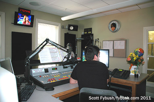 It’s lined with historic photos of WIKY, including the newspaper front pages from the 1981 fire – and from the south-facing window, it also boasts an impressive view outside to the WIKY tower, just down the slope across the parking lot from the studio.