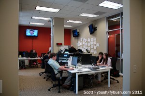 But when we stopped by for our quick visit in August, “Q101” was history, having given way to the Chicago incarnation of Merlin’s “FM News” operation. Known then as WWWN (and later as WIQI), “FM News 101.1” faced the same problem pretty much any new all-newser does when it tries to start up in an existing studio facility: the physical needs of an all-news operation are very, very different from any other radio format. “FM News” did the best it could: along one of the exterior walls of the studio complex, Merlin ripped out some existing programming offices and opened up a few walls to create a newsroom, down a hall and around a corner from the old music studio that was pressed into service as the all-news air studio. (It could have been worse: in New York, where Merlin rented space from Emmis for its “FM News 101.9” WEMP, the newsroom ended up at the other end of the complex from the air studio.)