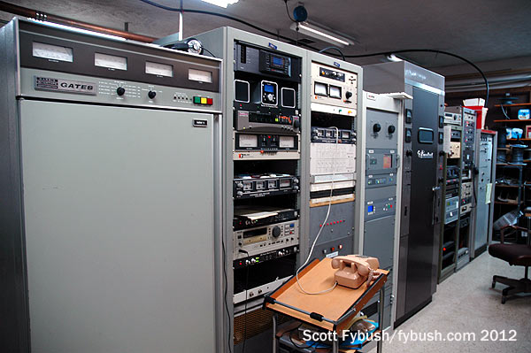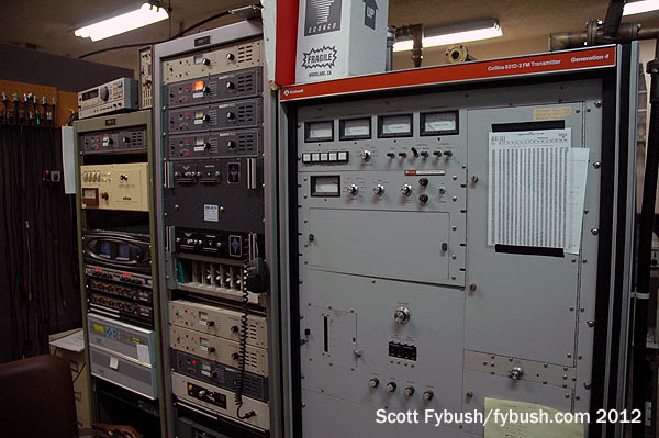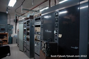 WBWN’s transmitter is southeast of Bloomington off US 150, but WBNQ and WJBC still come from the original 1949 transmitter building that’s attached to the back of the studio/office complex. It’s pretty clear, looking around this room, that Radio Bloomington’s engineers upgraded their AM and FM transmitters in lockstep: the old RCA BTA-1R1 for the AM is matched by a BTF-10D for the FM. The Gates MW-1 that was powering WJBC the night we visited matches an FM-20H3 for the FM, and the Collins 831 that was powering WBNQ matches a Collins 820 “Power Pebble” along the row of AM gear.