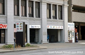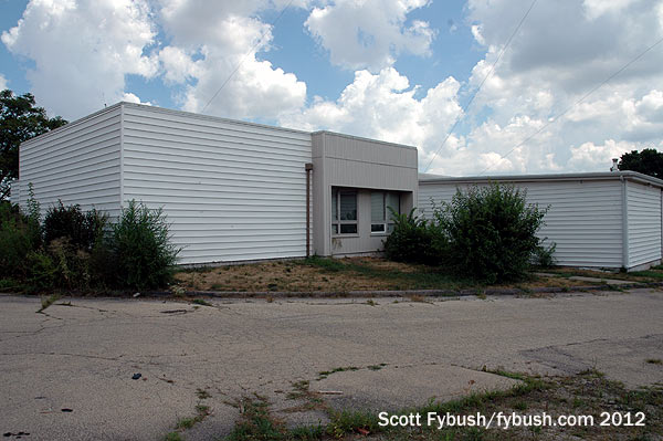 Not far down University, we find the former supermarket that’s been the home to CBS affiliate WMBD-TV (Channel 31) since the 1970s. WMBD was the last of the “big 3” stations to sign on here back in 1958, closing a chapter of TV history in which Peoria ended up as an all-UHF market. Channel 8 was originally allocated here, and even had a construction permit at one point for a WIRL-TV, but a shuffling of the dial moved that VHF channel westward to become a third allocation in the Quad Cities market, leaving just one commercial VHF (WCIA channel 3 over in Champaign) and a patchwork of UHF allocations that eventually shook out into the sprawling Champaign-Decatur-Springfield market. While WCIA’s ownership eventually bought sister CBS outlet WMBD-TV, Peoria remained its own separate market all along, and still is today. WMBD-TV remains co-owned with WCIA under Nexstar, and for now Nexstar also operates Bloomington-licensed Fox affiliate WYZZ (Channel 43) from here for Sinclair.